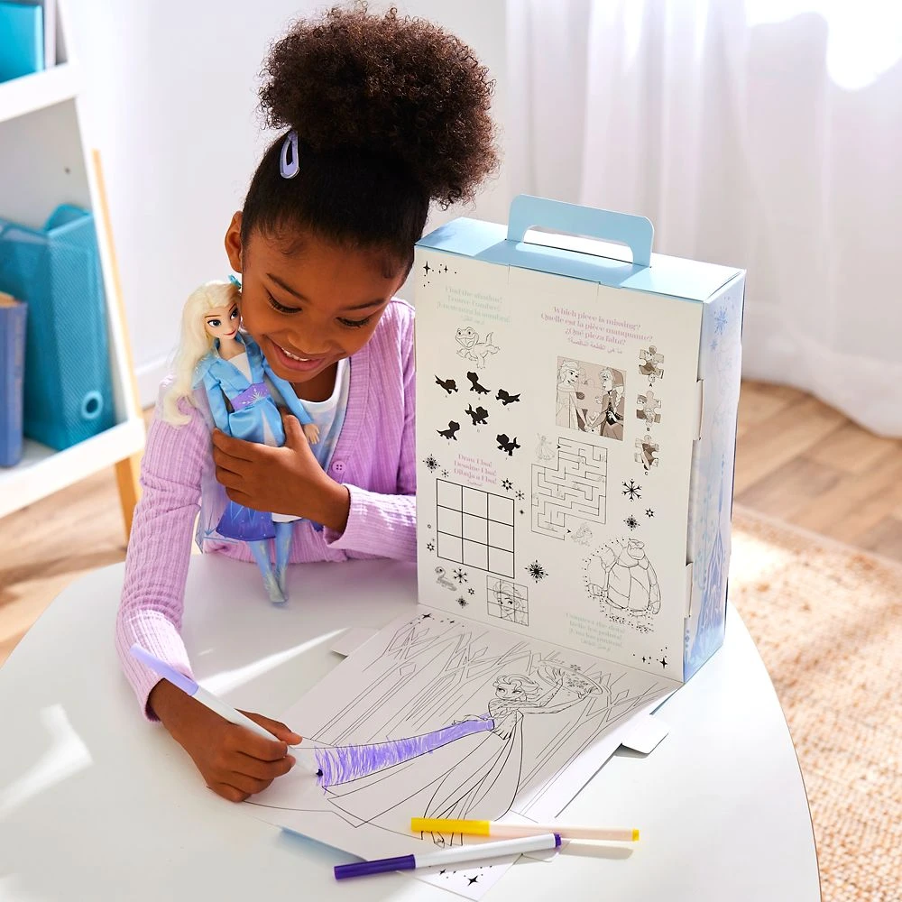 ”Show yourself. Step into your power. Grow yourself Into something new,” said Elsa. For the Disney Story Doll assortment, our beloved Classic Dolls are enhanced by additional clothing and accessories to more fully play out the character’s story. Recreate the film or imagine a brand new adventure! The plastic free, reusable, and recyclable packaging folds out into a play area stage, and features a coloring and activity sheet in back. Geometric snowflake patterns, sheer sleeves and cape provide an icy look for Elsa. Empower their imagination with this Frozen favorite. Includes Olaf and Bruni figures.